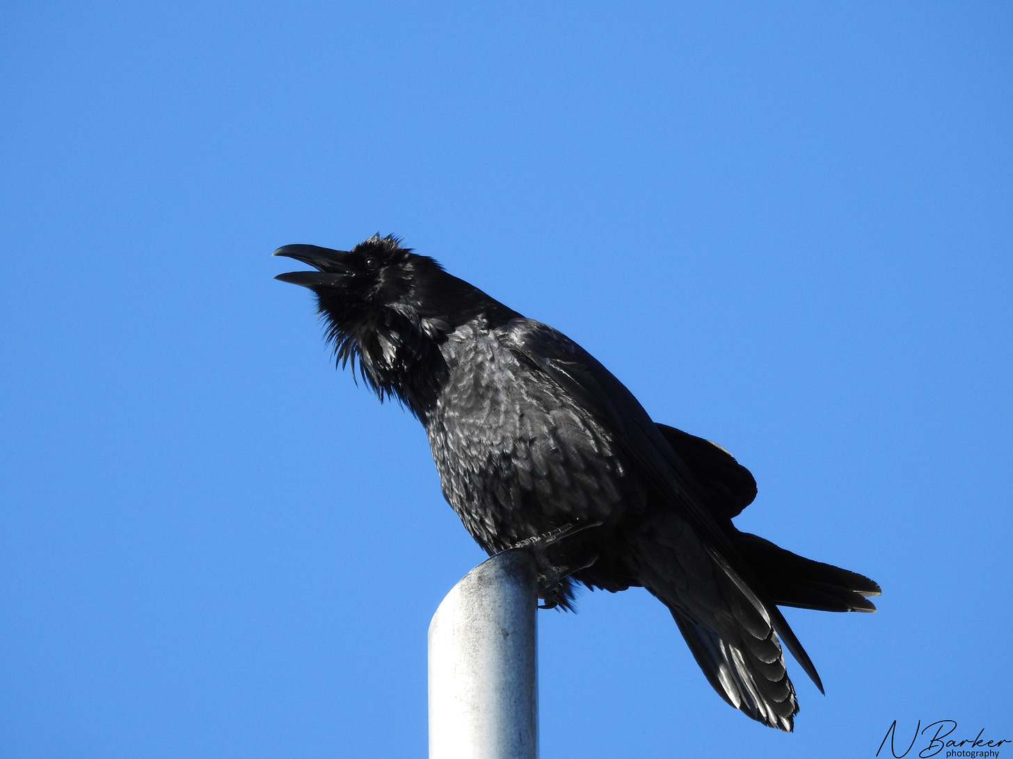 This Common Raven was passing through a local conservation area that I hike regularly. I heard the “Gronk! Gronk!” before I saw the Raven. The gronk call set off the local American Crows in a bit of frenzy as they began cawing in annoyed reply.