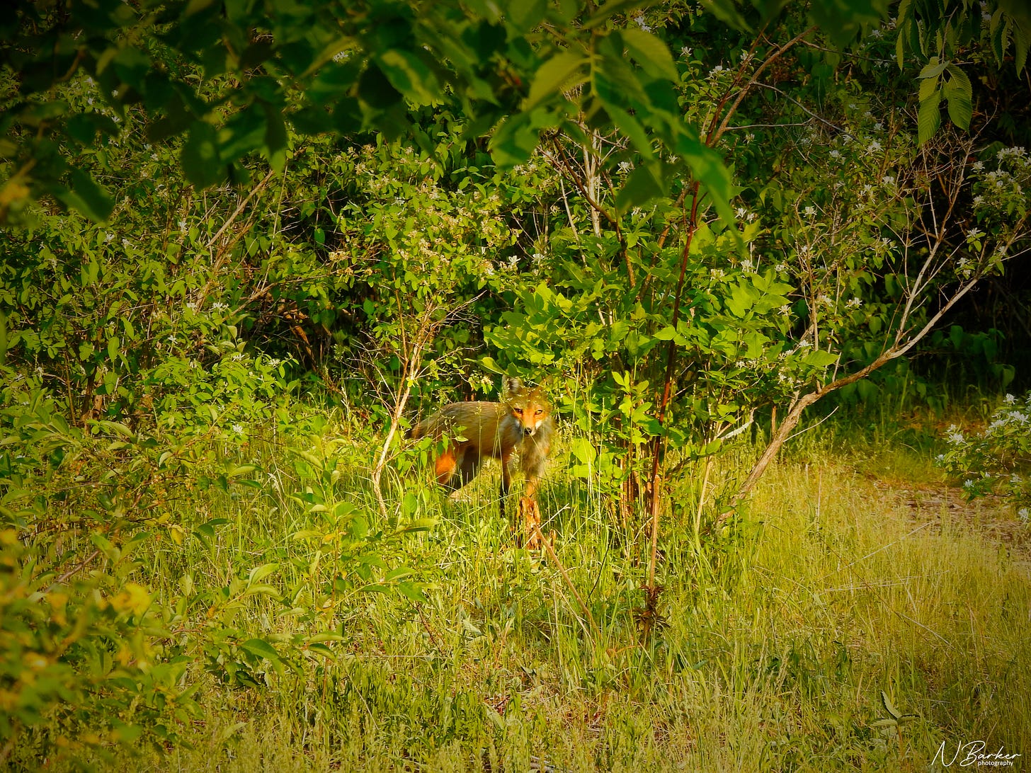 This is a Red Fox I was able to find with the help of some local American Crows. This was early in the morning in the summer of 2023 in a local conservation area where I hike on weekends. If I time my hikes just right, I can usually spot this Red Fox following a regular trail each morning.